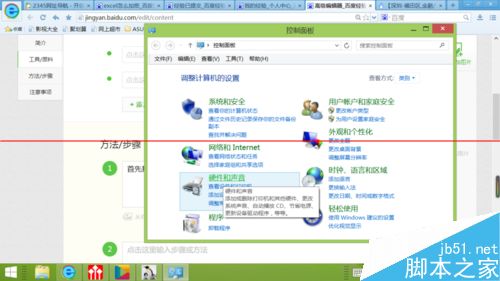 2、双击控制面板,在弹出框中选择:硬件和声音